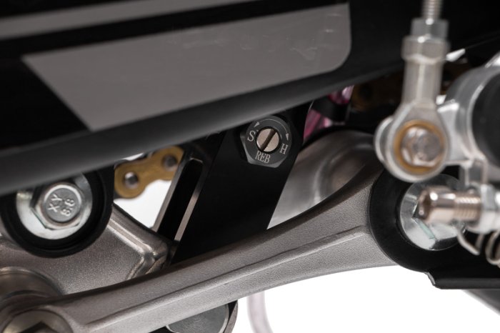 алюмінієвий маятник, пневмогідравлічний моноамортизатор з набором регулювань, хід 110 мм.